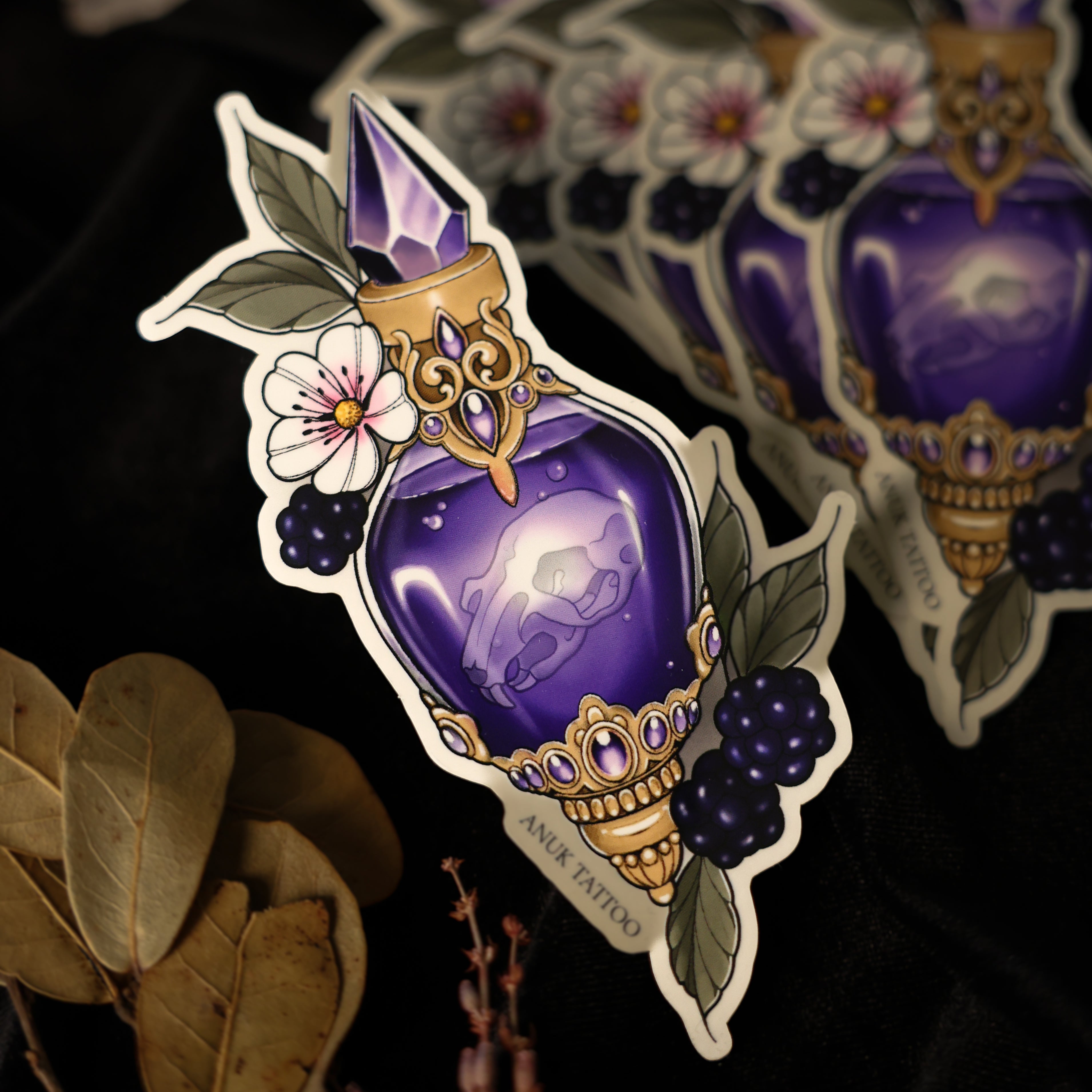 Dieser langlebige Aufkleber zeigt ein detailverliebtes Giftfläschchen mit Kristallverschluss, floralen Verzierungen und einem subtilen Totenschädel – perfekt für alle, die eine düstere, mystische Ästhetik lieben.