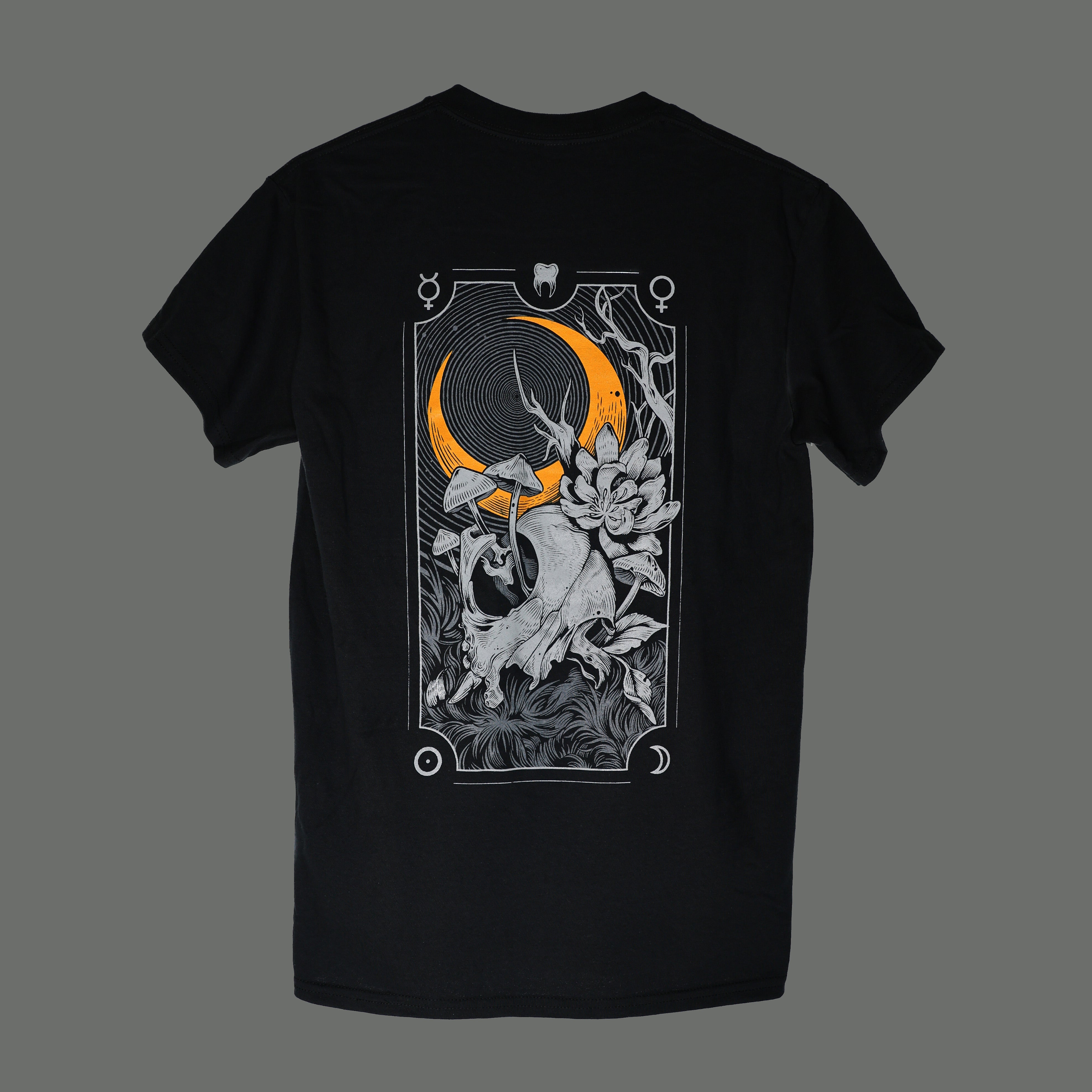 Dieses hochwertige Shirt kombiniert starke Symbolik mit nachhaltiger Qualität: Auf der Rückseite zeigt sich ein detailreicher 3-farbiger Siebdruck mit Hirschschädel, Mondsichel, Pilzen und floralen Elementen. Auf der Brust sitzt dezent das Sichelmond-Logo mit Kristall – schlicht, aber wirkungsvoll.